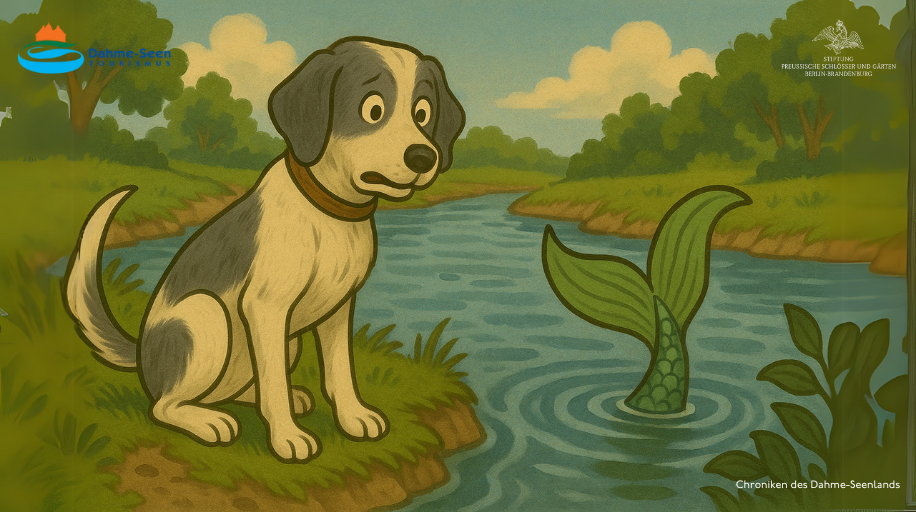 Jule lag faul im Schlosshof und genoss die warmen Sonnenstrahlen. Wie jedes Jahr verbrachte die Königsfamilie den Spätsommer und den Herbst in Schloss Königs Wusterhausen. Plötzlich riss sie ein lautes Platschen aus ihrer Ruhe. Es klang, als wäre etwas Schweres in den Nottekanal gefallen. Sofort sprang sie auf und rannte zur Uferkante. Als sie hinunter sah, erkannte sie gerade noch eine schimmernde Schwanzflosse, die im Wasser verschwand. Verwundert blickte sie hinterher.